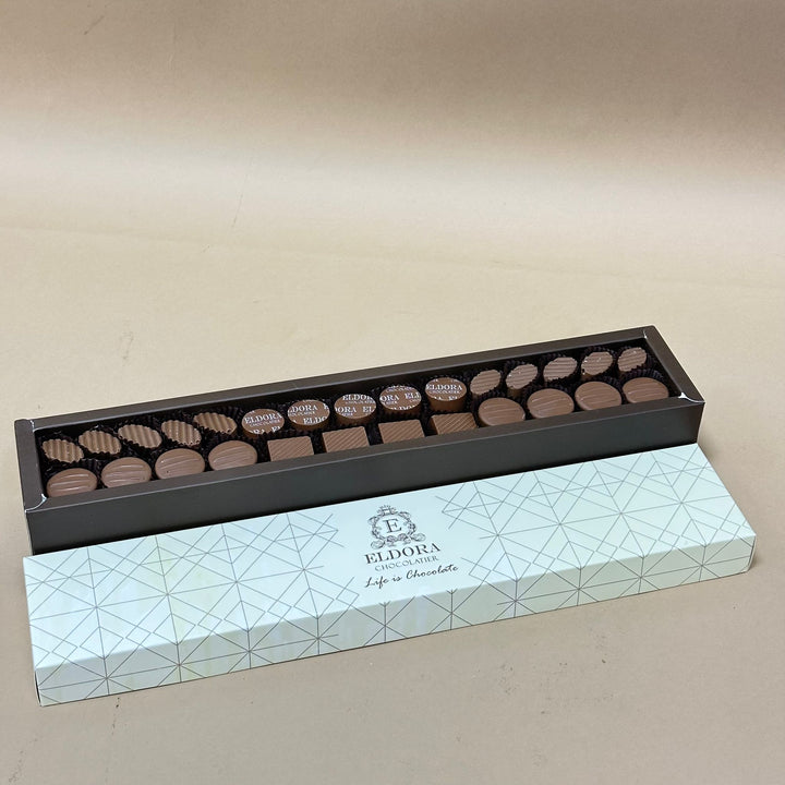 بوكس فاخر يحتوي على تشكيلة مختارة من الشوكولاتة بحشوات البيكان، صوص المرجان بالمكسرات، فواكه استوائية بالفستق، وكيندر كرانشي المقرمش. مزيج متناغم يجمع بين الطعم الغني والانتعاش الاستوائي.
