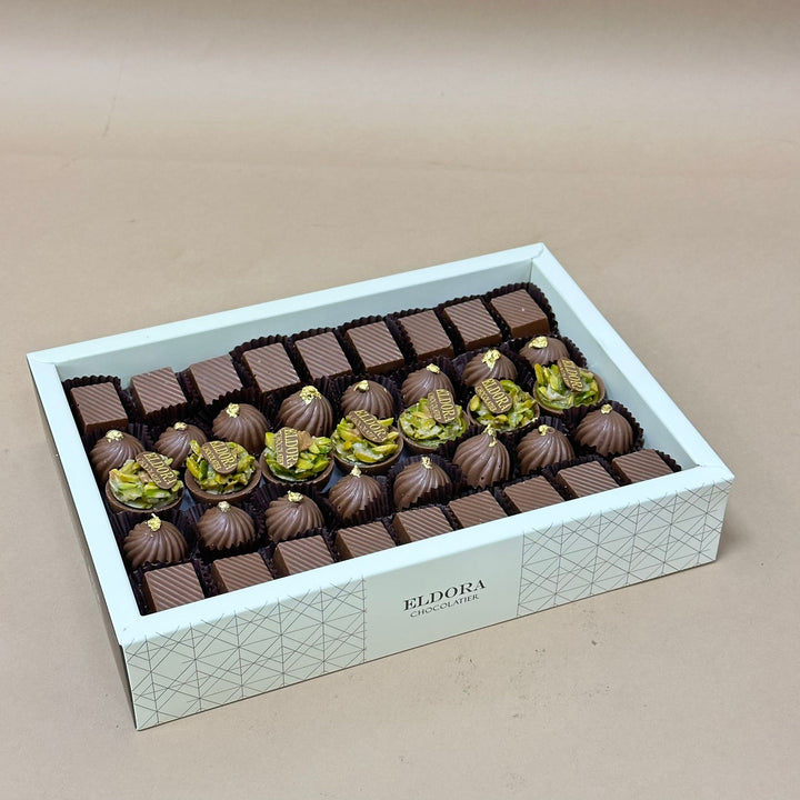 بوكس فاخر يحتوي على شوكولاتة بحشوات البستاشيو كراميل، حشوة اللوز بالبيكان، وصوص المرجان بالمكسرات. مزيج متكامل يجمع بين النكهات الفاخرة والقرمشة الغنية لمحبي الشوكولاتة المميزة.